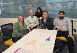 Additionally, in lieu of a full-agenda monthly meeting, we moved in a different direction for May by spending time engaging in the Marshmallow Challenge, developed by Peter Skillman and popularized by Tom Wujec.  For the challenge, we broke into small groups and equipped each group with a yard of string, a yard of masking tape, 20 sticks of spaghetti, and one marshmallow.  The goal for the challenge is simple: in 18 minutes, build the tallest free-standing structure possible to support the marshmallow placed on top.  While the goal is simple, our teams found that the challenge wasn’t as easy as they initially expected.  We learned about teamwork, collaboration, and creative thinking while working together on a common goal.