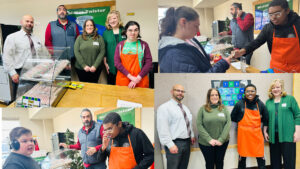 Clockwise from the top left: (1) Mike, Lisa, and Tricia are pictured with AJ (one of the school’s dedicated teachers) and Audrey (one of the students running the store that day); (2) Ashley (student), AJ, and Josh (another student running the store that day); (3) Mike, Lisa, and Tricia with Josh; and (4) Grayson (student), AJ, and Josh.
